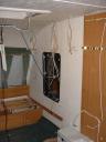 This is the view towards the front of the caravan, with all the electric cables hanging from the ceiling, where the zig control panel was located in the upper cupbard (there must be miles of cabling behind the wall/ceiling panels) - from this pic you can just make out a tear in the junction of the ceiling and wall, and to the lower right hand corner of the window, this is the side that hit the road when the caravan "fell-over".